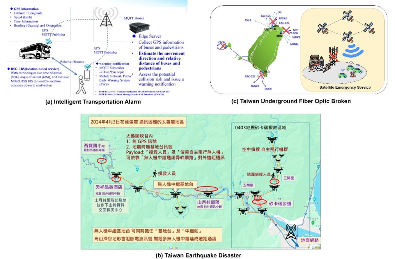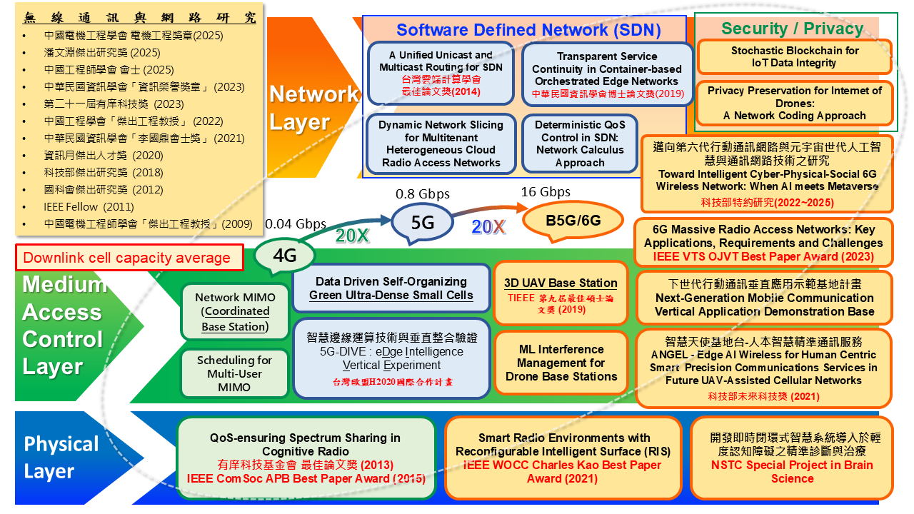 另一方面,無人機通訊網路也是6G無線通訊中具潛力的研究議題之一。面對目前無人機的多種新興應用:空中巡檢、空中物流運送、空中飛行基地台等,為了滿足上述應用,無人機需要具備完善的通訊聯網功能,以即時向地面站卸載空拍與飛行數據。如何設計一套能滿足高頻寬傳輸與高可靠度需求的通訊網路系統,是重要的研究挑戰。此外,利用AI與Edge AI來解決無人機網路能源管理、數據隱私與飛行安全等議題,也是重要且較少人深入探討的方向。最後,隨著物聯網技術的發展,車聯網與無人機聯網應用亦備受矚目。為了實現這些需要低延遲與高可靠度的通訊網路架構,邊緣計算(Edge AI)與FPGA/SDR實現將成為6G無線通訊中的核心支撐技術。