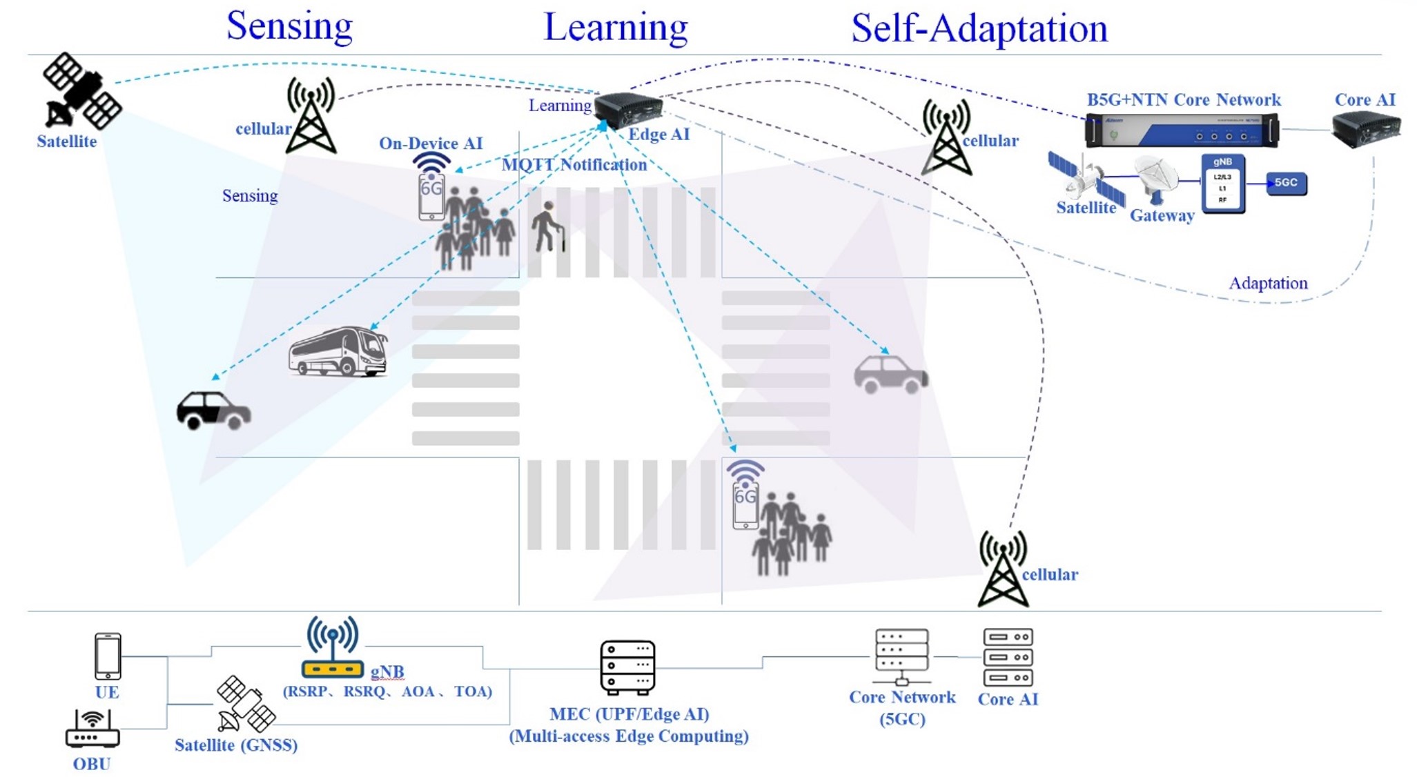 本系統的特色在於其自適應能力:在核心網路(5GC)與邊緣AI(Edge AI Gateway)的協作下,通訊節點能透過機器學習持續優化無線資源管理、網路佈署與移動管理。搭配B5G URLLC與MQTT通知協議,系統能夠在毫秒級延遲下,主動將碰撞風險訊息推送給行人與車輛,確保智慧交通中的安全性。另一方面,模組化的設計使得FPGA/SDR基地台可快速部署於學校周邊、商圈或無號誌路口,並可與衛星、蜂巢式網路與無人機通訊基站形成混合式網路。此種彈性化與智慧化的通訊架構,將不僅推進零死亡交通願景的實現,也為6G智慧城市中其他高可靠、低延遲應用(如遠端醫療、無人機巡檢、車聯網)提供堅實基礎。